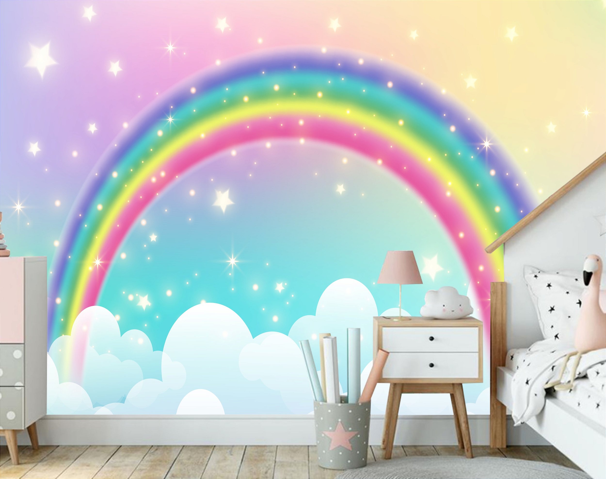 Papel de Parede Auto Adesivo Arco Íris Estrelas Nuvens M²