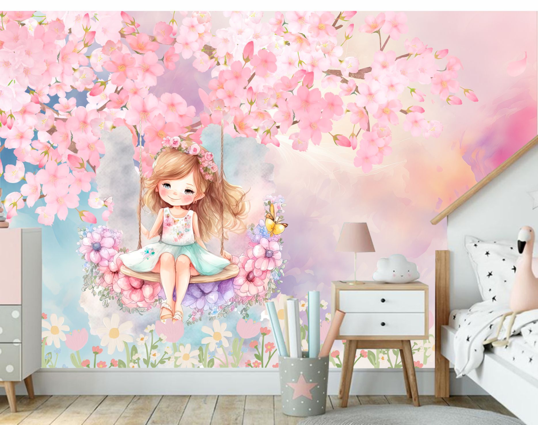 Papel de parede adesivo Menina no Balanço Floral Aquarela M²