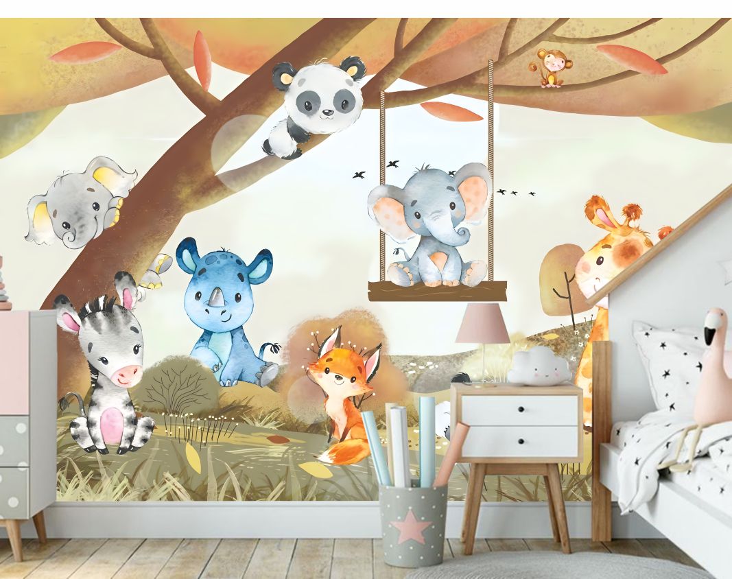 Papel de Parede Adesivo Safari Zoo Baby colors aquarela M²